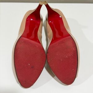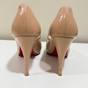 Beige Patent Leather Handmade Peep Toe Heel Platform Pumps.