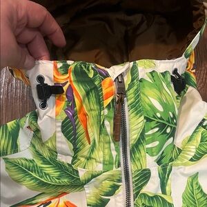 Leafy floral design with vibrant colors. Features a hood and zip closure. Ideal for outdoor adventures.