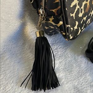 Chic crossbody bag with bold leopard print. Features a stylish tassel accent. Ideal for a trendy look.