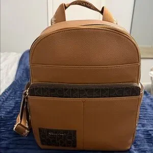 Elegant Calvin Klein backpack in brown. Features iconic logo accent with six exterior pockets and three interior pockets. Ideal for daily use. Approx. measurements 13”x11”.