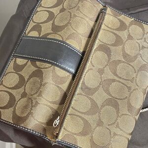 Elegant Coach wallet in tan canvas. Features black leather trim. Perfect for everyday use. The outside can be cleaned. Shows wear on the inside as shown in pictures. Dust bag included. Pulley is missing on the zipper, but it still functions regularly.