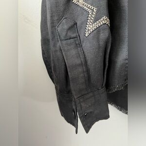 The Rails Loren shirt in black metallic stars is a slightly washed black, collared button down shirt jacket featuring metallic gold star embroidery. The shirt is the perfect addition to any wardrobe and will quickly become a wardrobe staple. The military details including patch pockets at chest, metal buttons and raw hem look great when teamed with denim whether it is worn on its own as a shirt or worn open over a t-shirt.