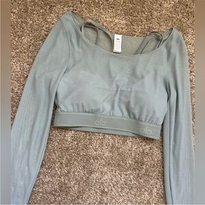 Stylish and sleek crop top by ALO Yoga. Light blue with long sleeves. Perfect for yoga or casual wear.