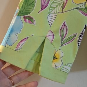 Chic lime green dress by Bob Mackie Studio. Ideal for stylish outings. Wear with or without the jacket. Worn one time. I didn't take to cleaners after wearing and just noticed a small spot shown in photo with my thumb. Will most likely come out but barely visible upon close examination. I know it is there so mentioned for total honesty.