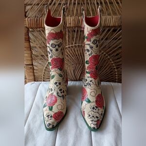 Step out in style with these unique floral skull print boots. Perfect for adding a bold touch to any outfit.