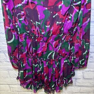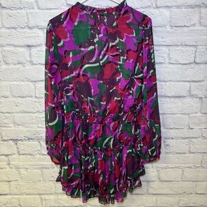 classic style in an abstract chiffon print with metallic threading throughout. Featuring a split neck opening with our signature petal string ties, this playful long sleeve mini dress has an elastic waist and a tiered skirt.