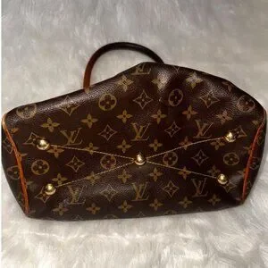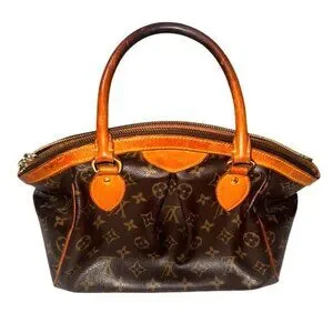 This Louis Vuitton Tivoli PM handbag features elegant monogram canvas and orange leather accents. Compact yet spacious, it's an ideal chic companion.