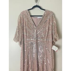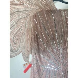 -Details: V-neck, Concealed back zipper closure, Designed for a floor-length look, Fully lined, Scalloped cape sleeves; allover alternating rows of sequins; beaded fabric, 100% polyester, MSRP $598 currently retailing for