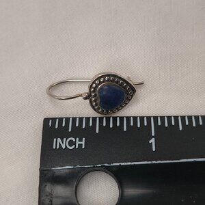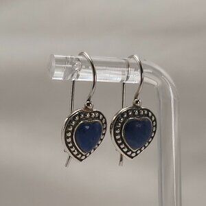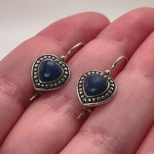 Sweet little sterling silver heart earrings with a deep-blue cabochon stone. Marked HAN 925 on the back. The stones have a lovely rich color. Blue cabochon stone, dyed stone alternative to Lapis, not confirmed what kind, but has a beautiful deep-blue look.