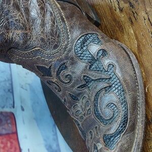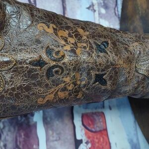 Elegant distressed brown boots with intricate embroidery. Perfect for a stylish, rustic look.