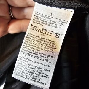 100% polyester black puffer winter coat. Faux fur detachable collar. Front and side pockets. Good pre-owned condition. Only flaw is some discoloration by collar (whitish hue). See photos. Approximate measurements: 20" chest, 27.5" length.