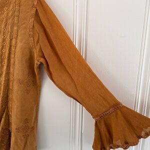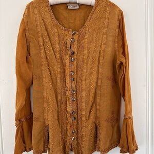 Vintage Braja Women's Mustard Bohemian Embroidered Button Down Top