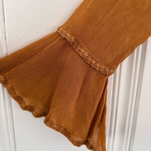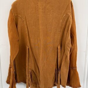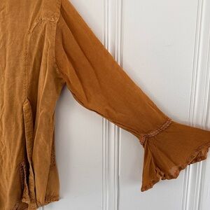 This vintage top was made by Braja Exclusives and is marked a size 1L as it was originally made in India. It’s a burnt orangish mustard color with an embroidered design on the front with buttons and a decorative edging around the whole pieces and on the sleeves. It measures 25in long, 18in wide at the chest, 20in wide at the end of the top and has sleeve openings that are 7in and measure 20in long.