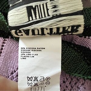 Spring summer 2008 ready to wear runway collection—shown as dress and different colorway in photos. Wide boat neckline. Cap sleeve with dangling tassel fringe detail. Cutout open weave knit with JPG logo. Purple, green, khaki beige, black. Viscose linen blend. Great vintage condition.