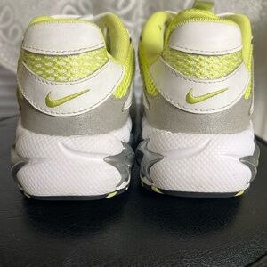Design: They feature a layered upper combining breathable mesh in neon green/yellow with synthetic leather overlays in white and metallic silver.