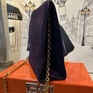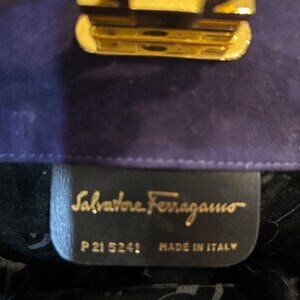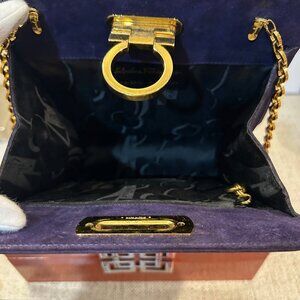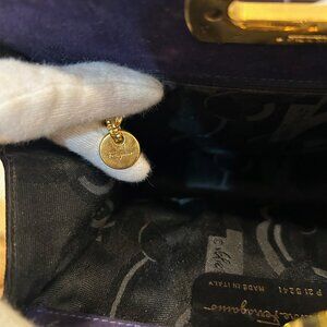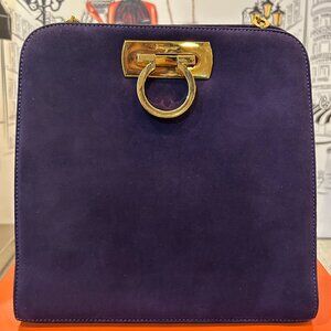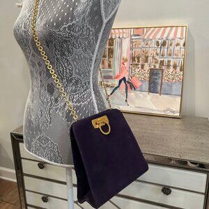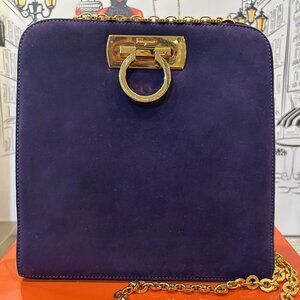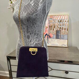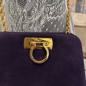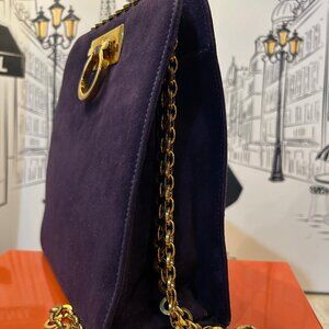 This is a vintage Salvatore Ferragamo Gancini shoulder bag in purple suede with gold-tone hardware. This classic Italian designer bag features the iconic Gancini clasp closure and a gold chain strap, a timeless and elegant piece often sought after by collectors. When I tell you that this handbag has little to no signs of use, BELIEVE IT! There are no marks on the suede, practically no scratches and no tarnishing on the hardware. This bag is in excellent used condition! You would be happy to add her to your collection! It was so popular that Ferragamo decided to do a re-make of this bag.