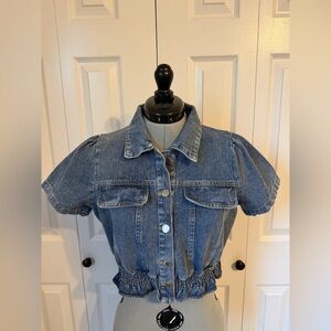 Stylish denim cropped top with button-up front, short puff sleeves, and ruched/smocked elastic bottom.