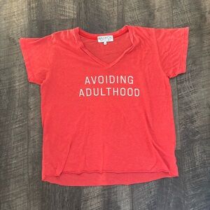Playful Wildfox tee with 'Avoiding Adulthood' print. Raw hem. Soft and comfy for everyday fun.