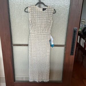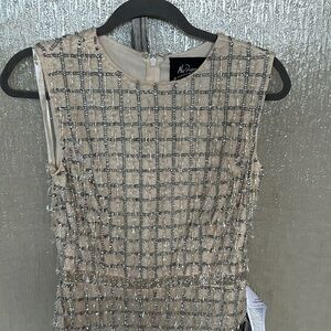 Mac Duggal 5471 Sleeveless High Neck Beaded Midi Sheath Dress NWT Nude