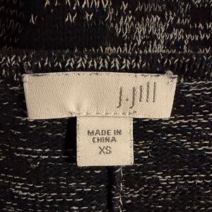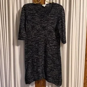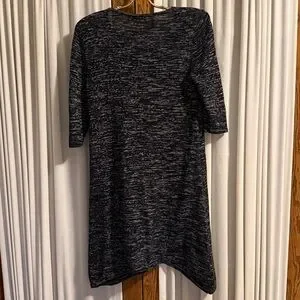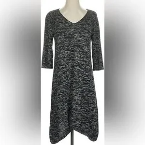 J. Jill Black Gray Heather Lightweight Knit 3/4 Sleeve Asymmetrical Hem Dress. A flattering and easy to wear dress. In a black and gray weathered lightweight knit. Pullover style. Curved V-neckline. 3/4 sleeves. Handkerchief hemline. Great condition. Pet and smoke free home.