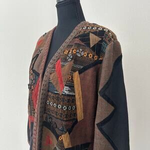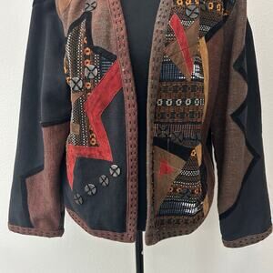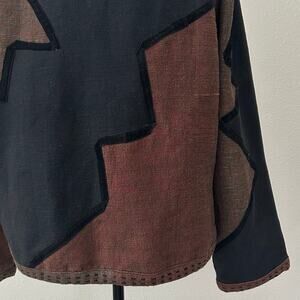 This is a unique, vintage Yak Magik women's jacket with a striking, artistic design. It features intricate hand-stitched patchwork and embroidery, showcasing a vibrant mix tapestry, stitching, suede, patchwork, and buttons. The jacket is made in Nepal. The design includes geometric patterns, a mix of black, brown, and red tones, and unique button details.