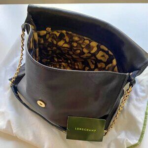 Longchamp Paris Rocks shoulder bag is sophisticated and rebellious accessory,perfectly sized for day or night. Crafted from soft yet strong lambskin leather. Leather and gold shoulder chain and metal eyelets. Flap secured with magnet closure. Zipper pocket on outside of bag. Inside has a zipper pocket, large pouch pocket for phone,keys, etc. Handbag is in excellent condition inside and out. Leather is so buttery soft and has a leather smell.