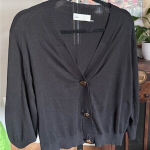 Chic black cardigan with elegant button accents. Versatile and stylish.