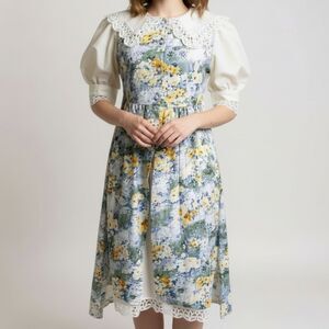 This beautiful vintage Jo Lene girls peasant dress captures timeless cottagecore charm with a soft floral print and romantic lace details throughout. Crafted from breathable 100% cotton, it features a statement lace-trimmed collar, puff sleeves with lace cuffs, and a full skirt finished with delicate lace at the hem. The button-front bodice adds a classic prairie silhouette, perfect for special occasions or heirloom-inspired everyday wear.