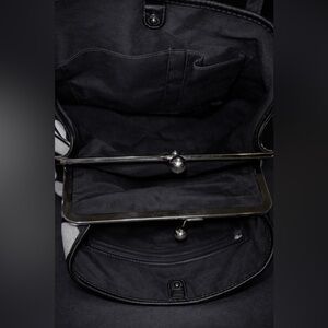 Beautiful & distinctive silver-tone kiss-lock clasp closure on the central compartment.