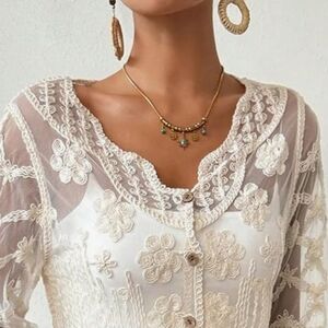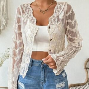 Elegant Lace Button-Up long sleeve see through Blouse (L)