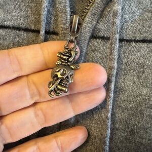 Super soft and Y2K cool Gray hoodie sweater with stripes, hoodie, front pockets, and skull zipper pull.