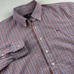 The product is a men's large slim fit button front shirt from Vineyard Vines, featuring a classic plaid pattern with a collared neckline and long sleeves. Made of cotton knit fabric, this multicolor shirt is perfect for travel, casual occasions, or business settings. The shirt also has accents like button closures, embroidered logo detailing, and a slimming fit, making it a stylish and versatile choice for various seasons such as summer, fall, and spring.
