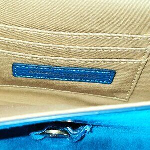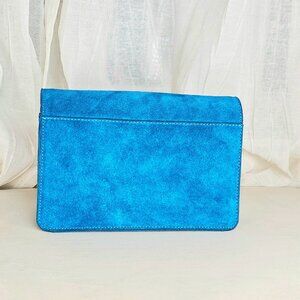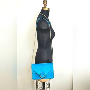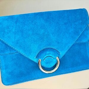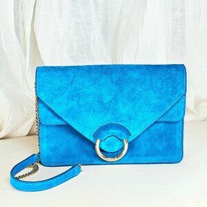 Brand new with tags Banana Republic crossbody bag in a striking vibrant turquoise-blue suede. The envelope-style flap and polished gold ring closure give this piece a modern, statement look while the removable chain strap allows it to be worn as either a crossbody or clutch.
