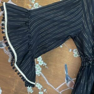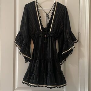 Fun flirty mini dress- very forgiving elastic waist, deep v neck, metallic thread details, Pom poms, back tie- can easily fit a size small as well/ I would keep it, just a little too short on me at 5’7 for my age :)