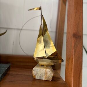 Signed MCM brass Gold Sailboat Sculpture on stone rock