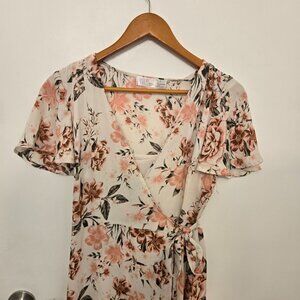 Beautiful Time and Tru floral wrap-style dress featuring a soft, feminine floral print in blush pinks, browns, and green on a light cream background.