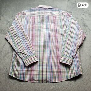 Add a bold pop of color to your wardrobe with this eye-catching Tallia long-sleeve button-up shirt. Featuring a vibrant plaid pattern in shades of pink, blue, green, yellow, and white, this shirt is perfect for making a statement at casual events, date nights, or creative work settings. Classic collar, white buttons, and buttoned cuffs complete the look. Excellent condition with no visible wear. Tallia is known for modern tailoring and standout prints — this piece is no exception.