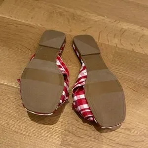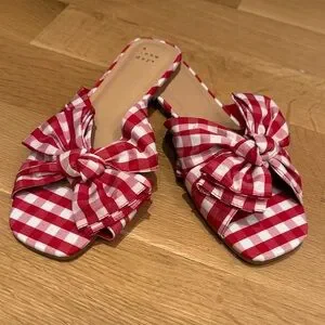 Charming red gingham sandals with a stylish bow. Ideal for casual outings.