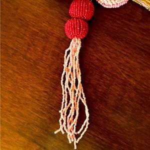 Pink beaded pouch with cupcake design and beaded tassel zipper pull. Perfect for minis and essentials.