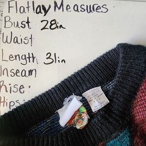 This is a true vintage statement piece! A bold and colorful abstract geometric knit sweater that is often referred to as a "Cosby sweater" due to the iconic style of the era. This eye-catching piece features a complex, vibrant pattern in a multi-color palette over a dark, black/charcoal base.
