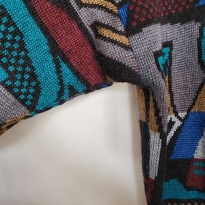 Style Tags: Vintage, 80s, 90s, Abstract, Geometric, Cosby Sweater, Oversized, Streetwear, Statement Sweater, Retro, Grandpa Sweater, Wool Blend, Knit, Crewneck, Colorful, Loud