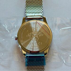 Gucci G-Timeless watch, featuring a diamond-adorned white mother of pearl dial and Swiss Quartz movement, ensures luxurious timeless elegance. • Brand: Gucci • Model: G-Timeless YA1264094 • Gender: Women’s • Dial: White Mother of Pearl with Diamond Markers • Movement: Swiss Quartz • Case Size: 36mm • Case Material: Stainless Steel • Bracelet: Stainless Steel • Water Resistance: 50m (5 ATM) • Clasp Type: Deployment Buckle • Authenticity: Swiss Made • Condition: New • Care: Clean with soft cloth for lasting shine