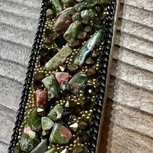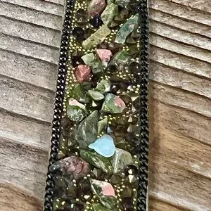 • Multi-Tone Crystal Cuff: A wide, stunning statement bracelet featuring "crushed stone" textured crystals in a mix of earthy and metallic hues.