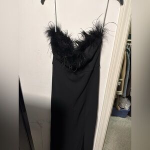 Stunning Lulus black strapless maxi dress featuring elegant feather trim along the neckline and a flattering column silhouette. Designed with a thigh-high slit for a sleek, modern look — perfect for formal events, weddings, galas, or special occasions.