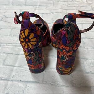 Bold floral platforms with a vibrant design. Features a chunky heel and ankle strap. Perfect for a statement look.
