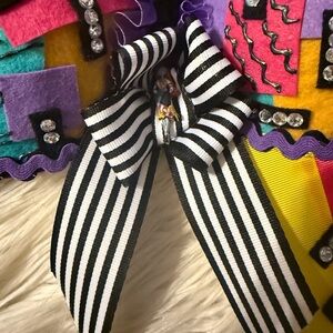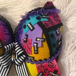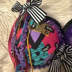 Handmade one of a kind NBC Sally bra. Inspired by Sally’s patchwork dress. Each felt piece was cut and placed individually on a dark purple bra. Fabric puffed paint was used to paint on details. Different types of colors and trim was used along the top and bottom of the bra cups. Stripped bows was used on one corner as well as the middle to tie in Jack skellington vibes. (Please note that patchwork may differ on each bra slightly as they are done handmade upon order) the color of the bra will either be black or purple depending on what’s available to me at the time in your size. Bra is brand new! From a smoke free home. Please allow 5-7 days from ordering to be made and shipped. If you need by a certain time please comment below prior to ordering to confirm.