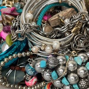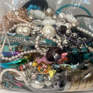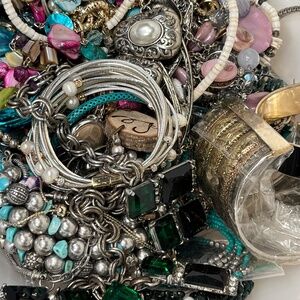 Includes necklaces, matched earrings, bracelets, cuff and possibly brooches and men's jewelry. Both statement and dainty chain pieces. Some pieces are in bags but most are an open treasure hunt. There may be tangles. Pictures ARE of lot you will receive. All pieces good to excellent condition. I didn't count, but probably about 70+ pieces. Sold as is. *CAN NOT Combine with other LOTS due to Postmark shipping ceiling.* Questions? Leave a comment below!