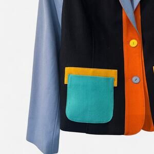 This wool-blend blazer features bold color blocking with contrasting sleeves, sculptural patch pockets, and a tailored silhouette that feels both artistic and architectural. The palette is playful yet grounded — perfect for elevating denim, trousers, or layering over dresses for an editorial look.