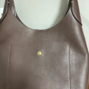 Sleek Coach shoulder bag in dark brown leather. Features a charming accessory for added style.