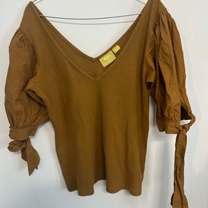 Stylish caramel blouse with a flattering V-neck. Features puff sleeves and tie details. Perfect for versatile wear.